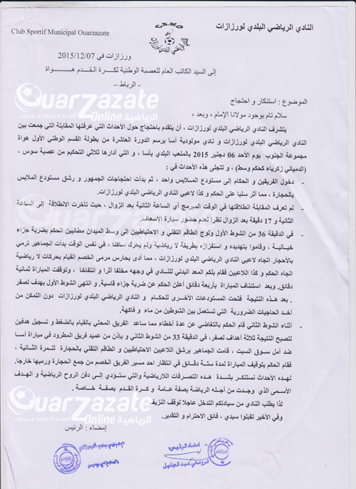 رسالة احتجاجية من النادي البلدي لورزازات إلى عصبة الهواة حول أحداث أسا