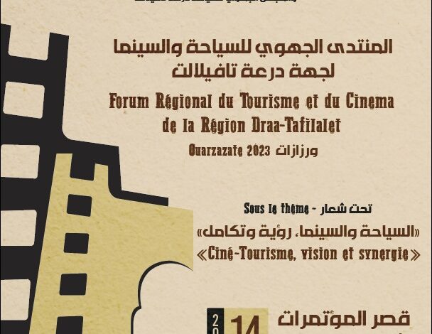 تنظم غرفة التجارة والصناعة والخدمات لجهة درعة تافيلالت بالتعاون مع مجموعة من الشركاء النسخة الأولى من المنتدى الجهوي حول السياحة والسينما تحت عنوان “القطاع السياحي والسينمائي، رؤية وتكامل” ودلك يوم الخميس 14 دجنبر 2023 في قصر المؤتمرات بوارزازات.
