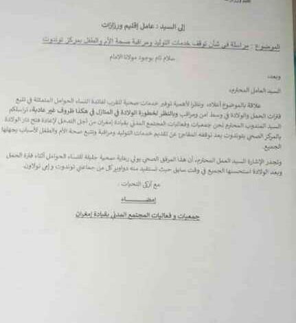 وجهت فعاليات المجتمع المدني بقيادة إمغران مراسلة إلى عامل إقليم ورزازات بشأن توقف خدمات الولادة ومراقبة صحة الأم والطفل بالمركز القروي بجماعة توندوت بإقليم ورزازات.