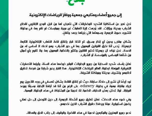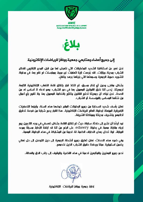 و بناء على ذلك، تعلن الجمعية و بأسف شديد انسحابها من جميع البطولات المقرر خوضها هذه السنة، وأبرزها التصفيات الإفريقية المؤهلة لبطولة العالم للرياضات الإلكترونية، هذا القرار سيحرم شبابنا من فرصة تحقيق أحلامهم وتشريف مدينتنا ومملكتنا الشريفة.