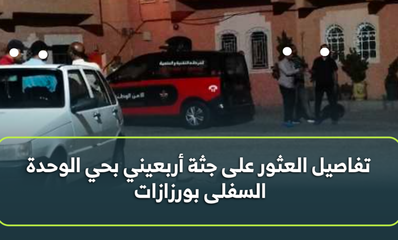 إستنفر حادث العثور على جثة شاب في الاربعينيات من عمره السلطات الأمنية بحي الوحدة السفلى بورزازات و ذلك بعد منتصف ليل يوم امس السبت،