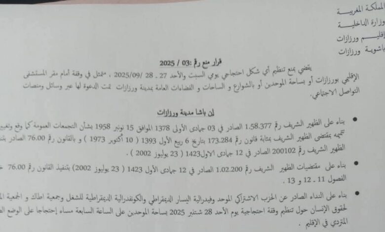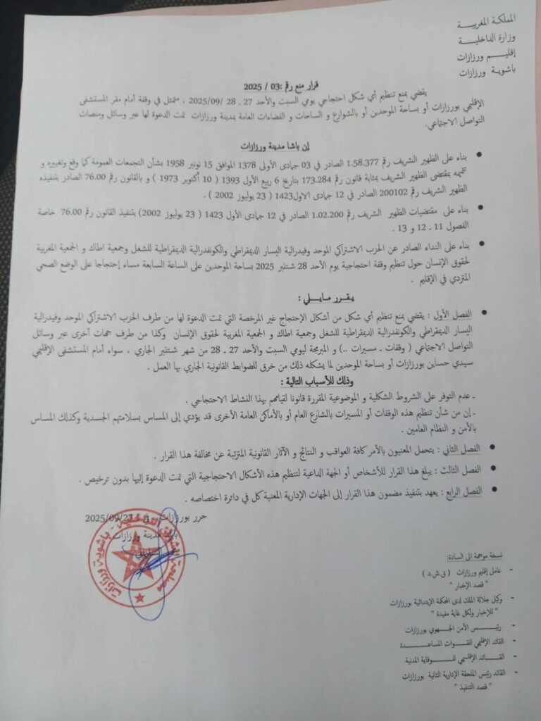 أصدرت باشوية مدينة ورزازات قرارا إداريا يقضي بمنع تنظيم أي شكل من أشكال الاحتجاج غير المرخص خلال يومي السبت والأحد 27 و28 شتنبر 2025، وذلك على خلفية دعوات تم تداولها عبر منصات التواصل الاجتماعي لتنظيم وقفات احتجاجية أمام المستشفى الإقليمي سيدي حساين، ساحة الموحدين، وفي عدد من الشوارع والساحات العمومية بالمدينة.