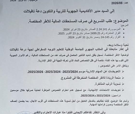 دخل المكتب الجهوي للجامعة الوطنية للتعليم – التوجه الديمقراطي بجهة درعة تافيلالت على خط أزمة تأخر المستحقات المالية للأطر المختصة، حيث وجه مراسلة رسمية إلى السيد مدير الأكاديمية الجهوية للتربية والتكوين يطالب فيها بالتدخل العاجل لتسوية الوضعية المالية لهذه الفئة.