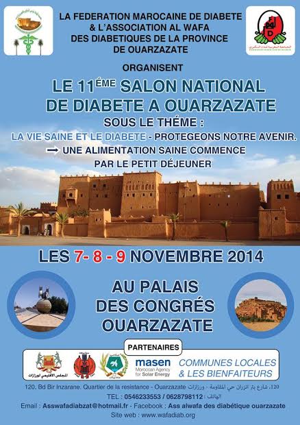 بمناسبة اليوم العالمي لداء السكري تنظم الجامعة المغربية لدا السكري وجمعية الوفاء لمرضى السكري بإقليم ورزازات المعرض الوطني الحادي عشر (11) بمقر المؤتمرات لمدينة ورزازات و ذلك أيام 07-08 و 09 نونبر 2014.