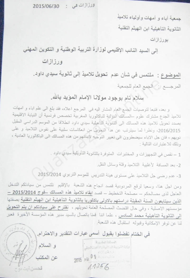 توصلت ورزازات أونلاين بملتمس من جمعية أباء و أمهات وأولياء تلاميذ الثانوية التأهيلية ابن الهيثم التقنية بورزازات إلى كل من السيد النائب الإقليمي لوزارة التربية الوطنية بورزازات ، و كذا إلى السيد مدير الاكاديمية الجهوية للتربية والتكوين تعبر فيها عن إستيائها من القرار المفاجئ و المجحف في حق تلاميذ الجدع المشترك علوم – المسالك الدولية للبكالوريا المغربية تخصص فرنسية ، بعدمــا قررت النيابة الإقليمية ” و بشكل مفاجىء و دون علم الأباء و الأولياء مسبقا” العمل على نقل التلاميذ إلى الثانوية التأهيلية سيدي داود عوض مؤسستهم الأصلية الثانوية التقنية إبن الهيثم في الموسم الدراسي المقبل ،