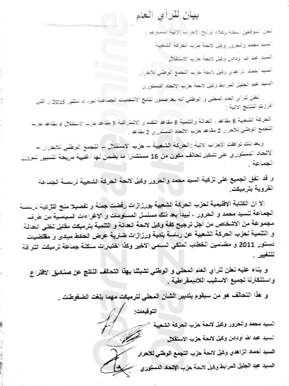 و قد وضح نص البلاغ أيضا أن الأطراف الأربعة المتحالفة متشبتة بموقفها في ما يخص رئاسة الجماعة ، إستنادا إلى ما تضمنه دستور 2011 ، و كذا ما جاء في الخطاب الأخير لجلالة الملك محمد السادس قبيل موعد الإنتخابات ،