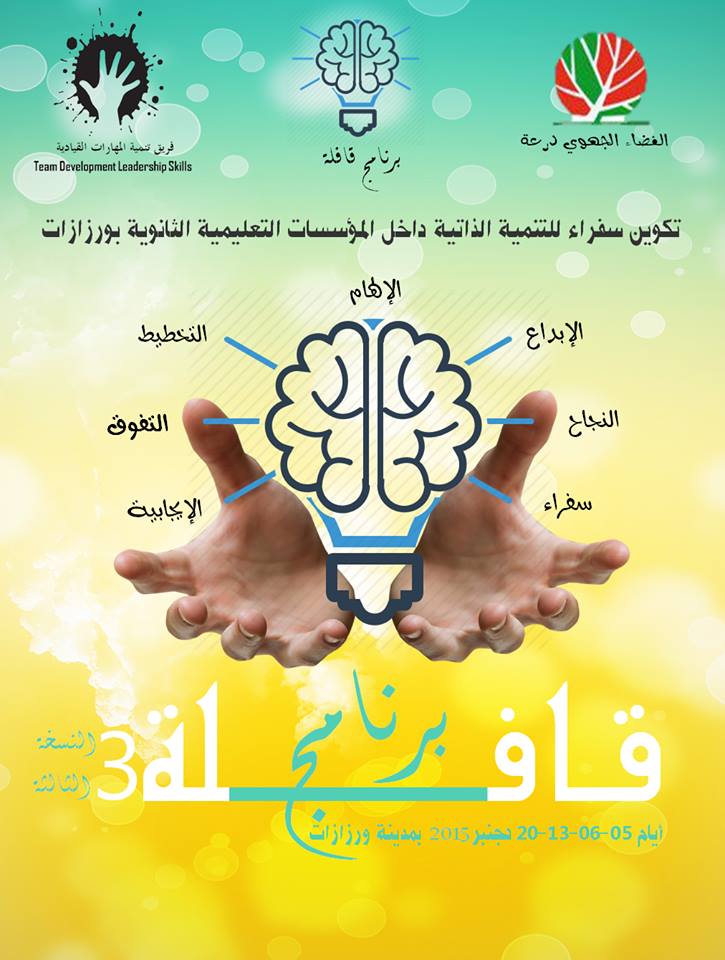 بعد نجاح النسختين الاولى والثانية لبرنامج قافلة ،يعتزم فريق تنمية المهارات القيادية بشراكة مع الفضاء الجهوي درعة تنظيم النسخة الثالثة من البرنامج .التي تهدف الى تكوين سفراء للتنمية الذاتية داخل المؤسسات التعليمية الثانوية بورزازات .