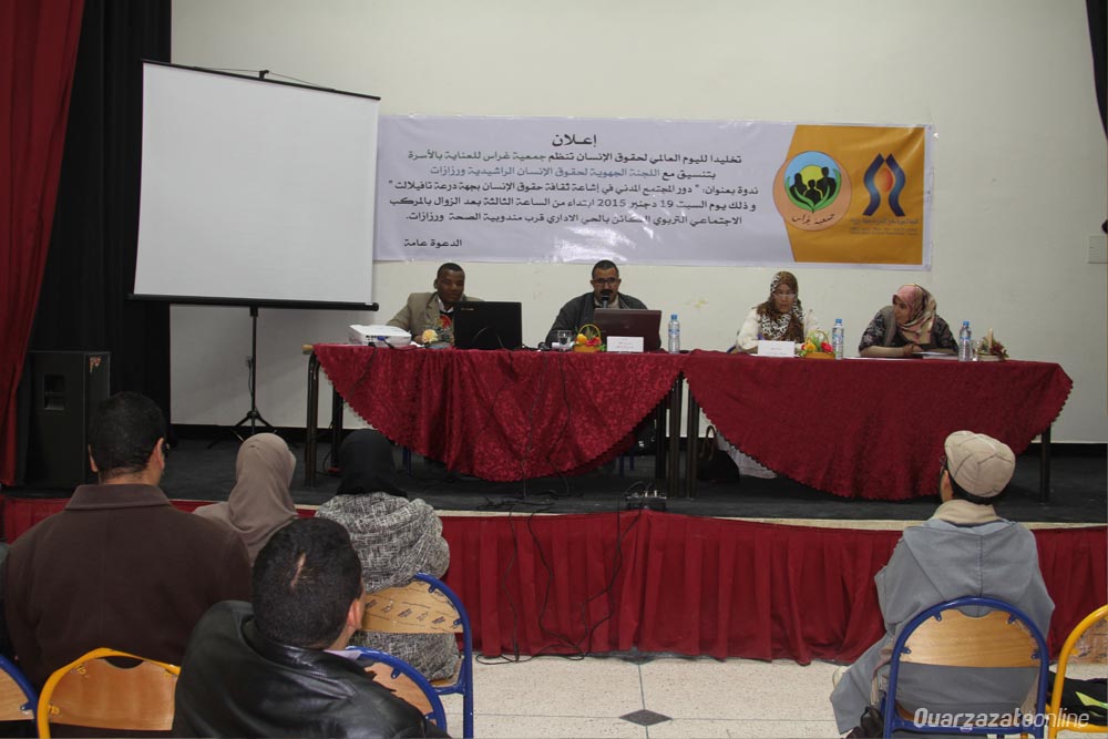 دور المجتمع في إشاعة و ترسيخ ثقافة حقوق الإنسان بجهة درعة تافيلالت هو عنوان ندوة شهدها المركب التربوي الإجتماعي بالحي الإداري بورزازات مساء اليوم ، نظمتها جمعية غراس للعناية بالأسرة بتنسيق مع اللجنة الجهوية لحقوق الإنسان بورزازات و الراشيدية ،