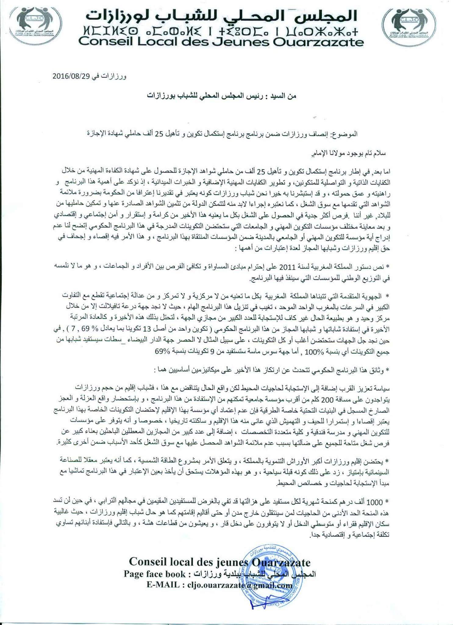 عرفت الساحة الورزازية خلال الأسبوعين المنصرمين إعادة تحريك المجلس المحلي للشباب بورزازات للمذكرة الترافعية الخاصة بإنصاف إقليم ورزازات خاصة و جهة درعة تافيلالت عامة من برنامج تكوين و تأهيل 25 ألف من حاملي شواهد الإجازة ، بحيث عقد المجلس الشبابي مجموعة من اللقاءات مع المسؤولين المحليين إضافة إلى إرسال المذكرة الترافعية التي أعدها إلى الحكومة المغربية و الوزاراة المعنية بالموضوع إضافة إلى رئيس جهة درعة تافيلالت و المؤسسات الجهوية المرتبطة بالموضوع و في هذا الإطار نقدم إليكم السادة المرسل إليهم :