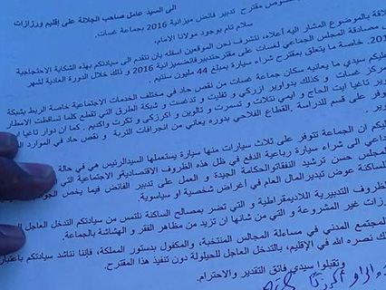 وجهت ساكنة الجماعة الترابة غسات والواقعة ضواحي ورزازات شكاية احتجاجية مرفقة بعريضة تحمل توقيعاتهم الى عامل الاقليم وذلك احتجاجا على قرار يتعلق بإقدام رئيس المجلس الجماعي لغسات على تخصيص 44 مليون سنتيم من ميزانية الجماعة قصد شراء سيارة من نوع “كات كات”.