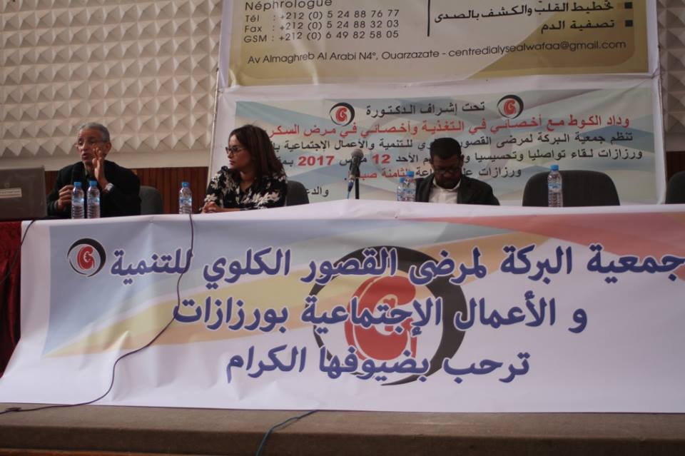 في اطار الجهود التي يبدلها المجتمع المدني للتحسيس بخطورة الأمراض المزمنة بشراكة مع القطاع الخاصة العامل في مجال علاج الامراض المزمنة ، وبمناسبة اليوم العالمي للكلي و تماشيا مع برنامجها السنوي نظمت جمعية البركة لمرضى القصور الكلوي للتنمية و الاعمال الاجتماعية بورزازات لقاءا تواصليا تحسيسيا أمس الاحد 12 مارس 2017 بالقصر البلدي بورزازات.