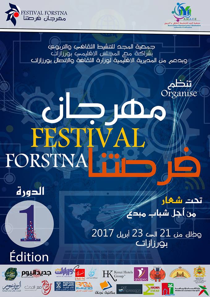تحت شعار “من أجل شباب مبدع”، تنظم جمعية المجد للتنشيط الثقافيوالتربوي بورزازات بشراكة مع المجلس الإقليمي لورزازات، و بدعم من وزارة الثقافة، الدورة الأولى لمهرجان “فرصتنا”,وذلك من 21 إلى 23 أبريل2017، بقصر المؤثمرات بمدينة ورزازات.