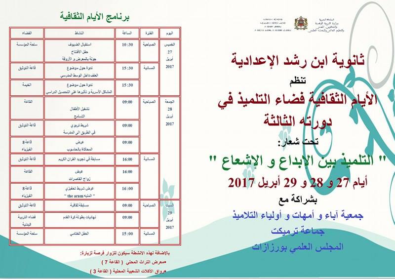 لأن التلميذ هو محور المنظومة التعليمية و لأن تكوينه يستدعي إدماجه في عدد من الميادين و التنقيب عن إبداعاته و مواهبه و لأن المدرسة فضاء رحب للتكوين و التثقيف، تعتزم ثانوية ابن رشد الإعدادية بترميكت تنظيم الأيام الثقافية فضاء التلميذ في دورته الثالثة أيام 27 و 28 و 29 أبريل 2017 بشراكة مع المديرية الإقليمية لوزارة التربية الوطنية و التكوين المهني و التعليم العالي و البحث العلمي و جمعية آباء و أمهات و أولياء التلاميذ و جماعة ترميكت و المجلس العلمي بورزازات. تحت شعار: ” التلميذ بين الإبداع و الإشعاع”.