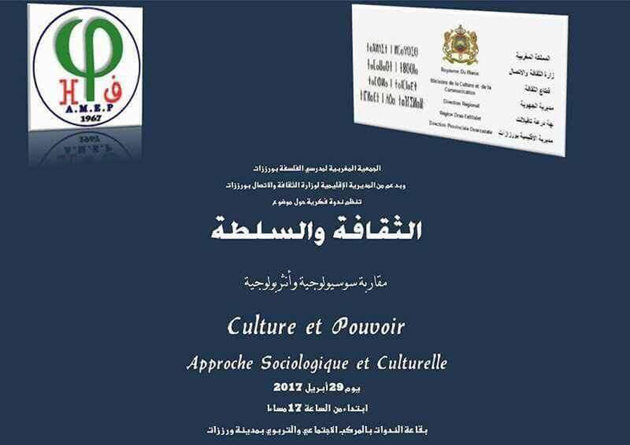 نظمت الجمعية المغربية لمدرسي الفلسفة بورزازات، بدعم من المديرية الإقليمية لوزارة الثقافة والاتصال بورزازات، ندوة بعنوان “الثقافة والسلطة مقاربة سوسيولوجية وأنثروبولوجيا” بالمركب الاجتماعي والتربوي بورزازات.