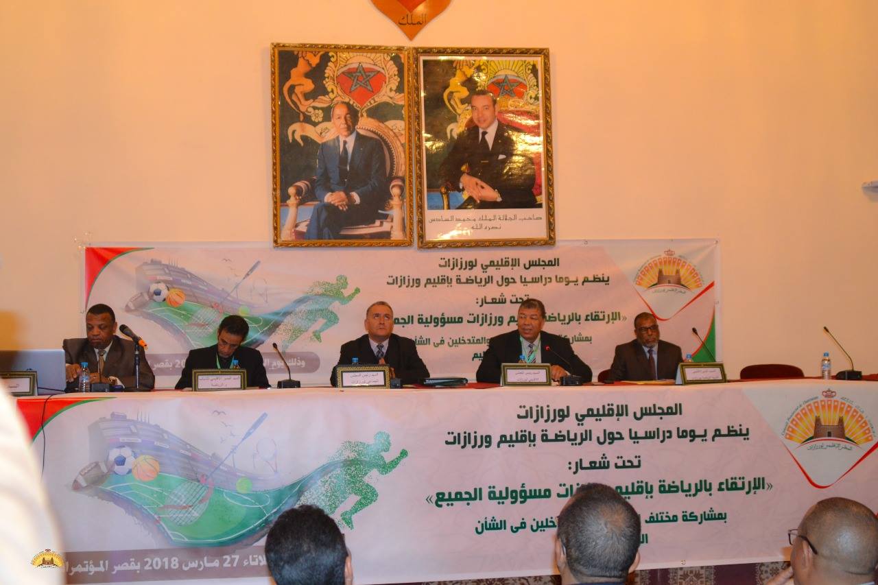 نظم المجلس الإقليمي لورزازات يومه الثلاثاء 27/03/2018 يوما دراسي حول واقع وآفاق الرياضة بالإقليم، حيت شارك في هذا اللقاء ممثلي القطاع بالاقليم و مهتمين ورياضيين ومؤسسات اقتصادية ،إضافة إلى الجماعات الترابية، ،ومختلف الجمعيات والأندية الرياضية المنضوية تحت مختلف العصب، وكذا فعاليات رياضية محلية.وشكل اليوم الدراسي الذي احتضنه قصر الثقافة و المؤتمرات تحت شعار: ” الارتقاء بالرياضة في إقليم ورزازات مسؤولية الجميع”. مناسبة للوقوف على واقع الممارسة الرياضية وكذا واقع البنيات التحتية الرياضية على امتداد تراب الإقليم.