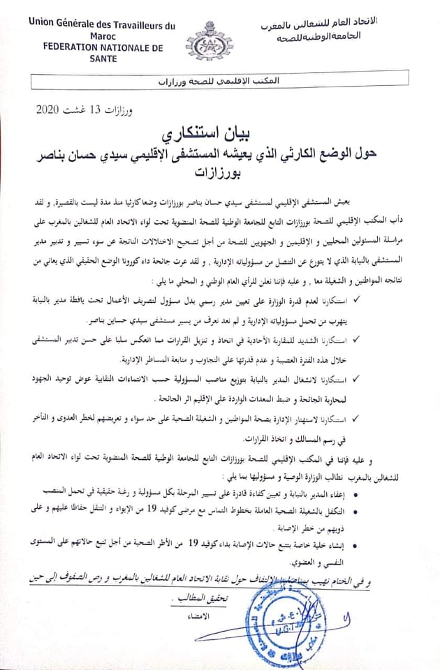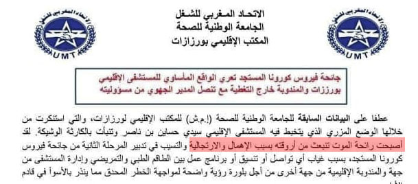أمام هذا الوضع الذي يدمع العين، خرجت عدد من الهيئاء النقابية عن صمتها و أصدرت بلاغات تشجب الوضع الحالي الذي وصل اليه المستشفى و كذا طريقة التعامل مع المصابين و المخالطين في هذه المرحلة الحساسة محملين المسؤولية الكاملة عن الوضع الحالي للمشرفين على القطاع الصحي بالاقليم و كذا إدارة المستشفى.