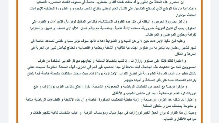 البيان أكد أن استمرار الوضع على ما هو عليه الآن خلق نقاشا قلقا و مضطربا، خاصة في صفوف الفئات المتضررة اقتصاديا واجتماعيا من هذا الوضع الذي لم يفلح القائمين على الشأن العام الوطني بإقناع الشعب بالجدوى و الضرورة الحقيقية للإجراءات المتخذة مؤخرا.
