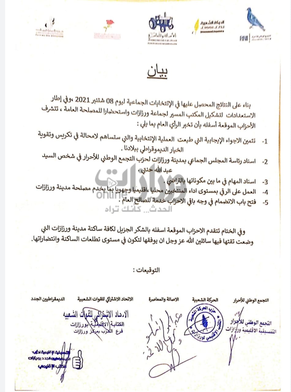 أصدرت الأحزاب المتحالفة في تحالف جماعة مدينة ورزازات بيانا، أكدت فيه على إسناد رئاسة المجلس اليلدي لورزازات للسيد عيد الله حنتي لائحة الجماعة عن التجمع الوطني للأحرار، وجاء في البيان ما يلي :